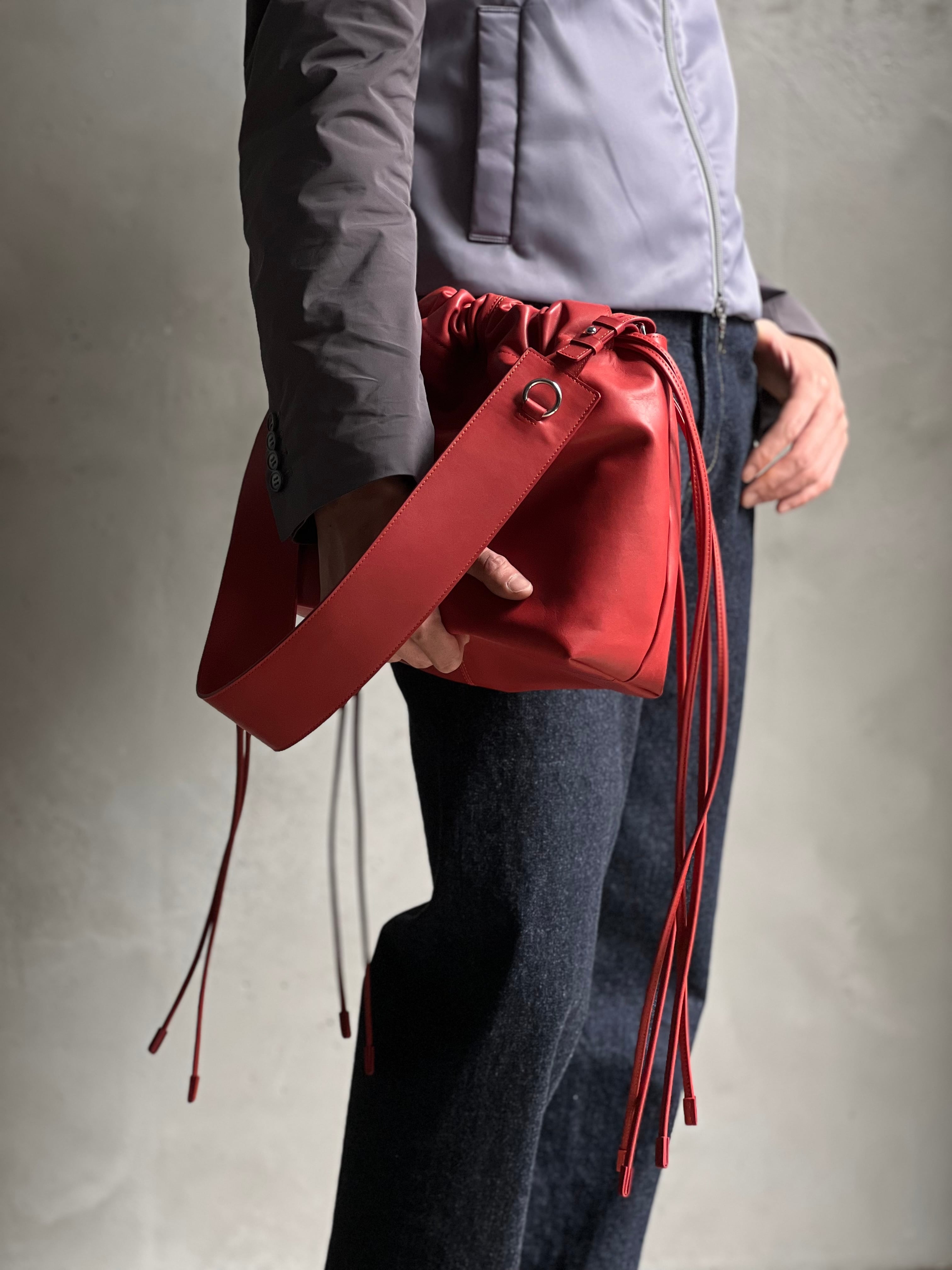 カウレザーを使用した巾着型レザーバッグ。