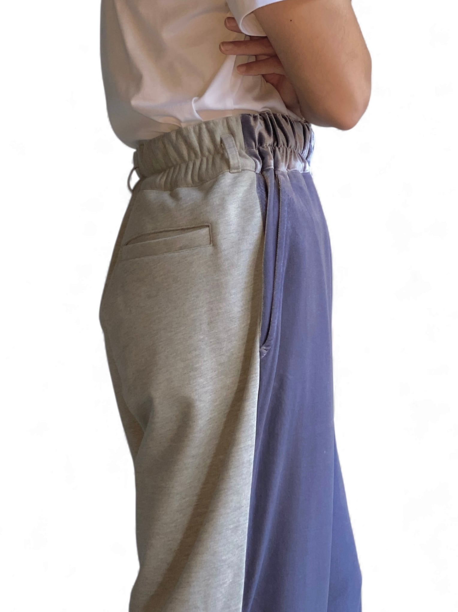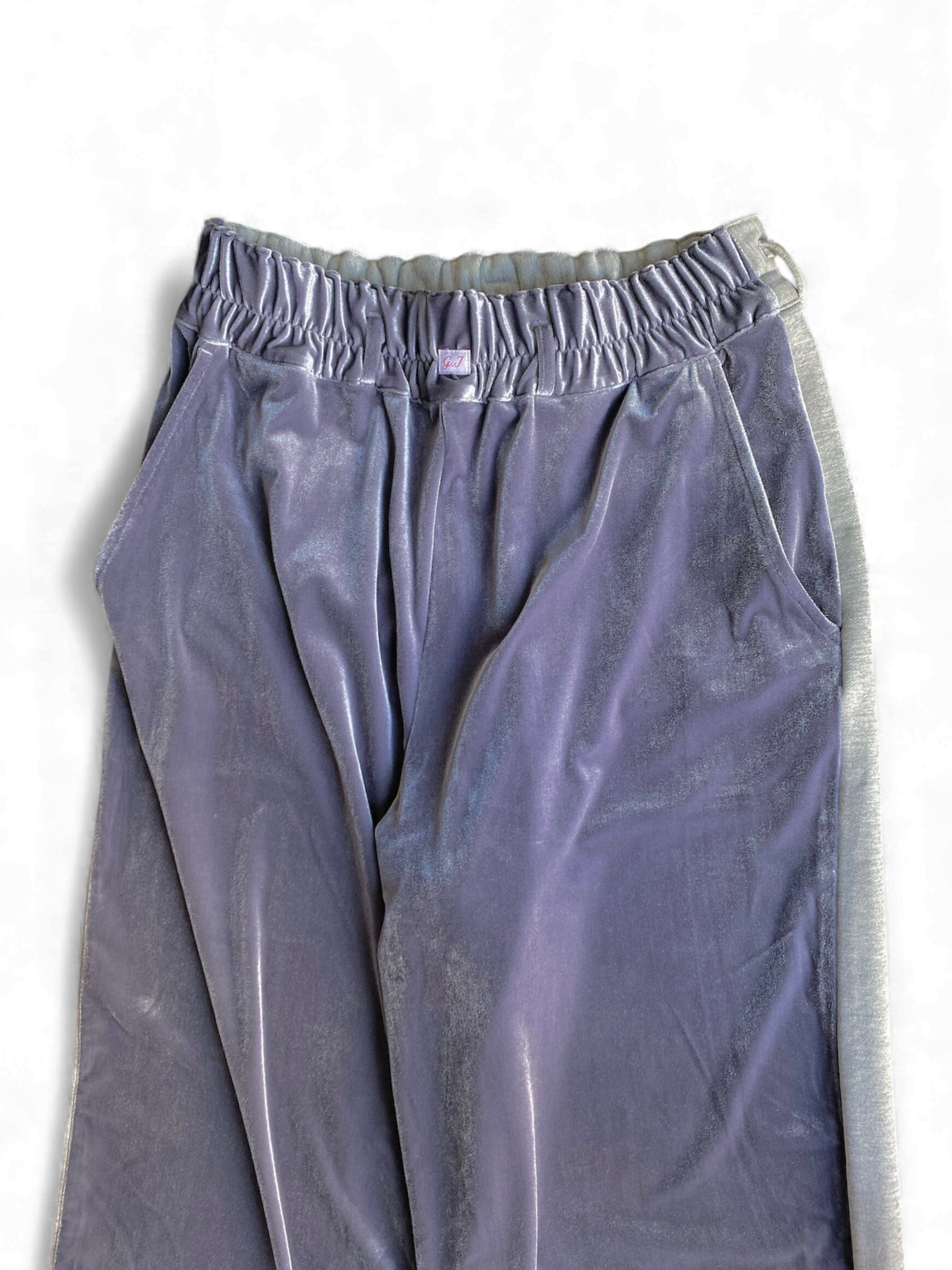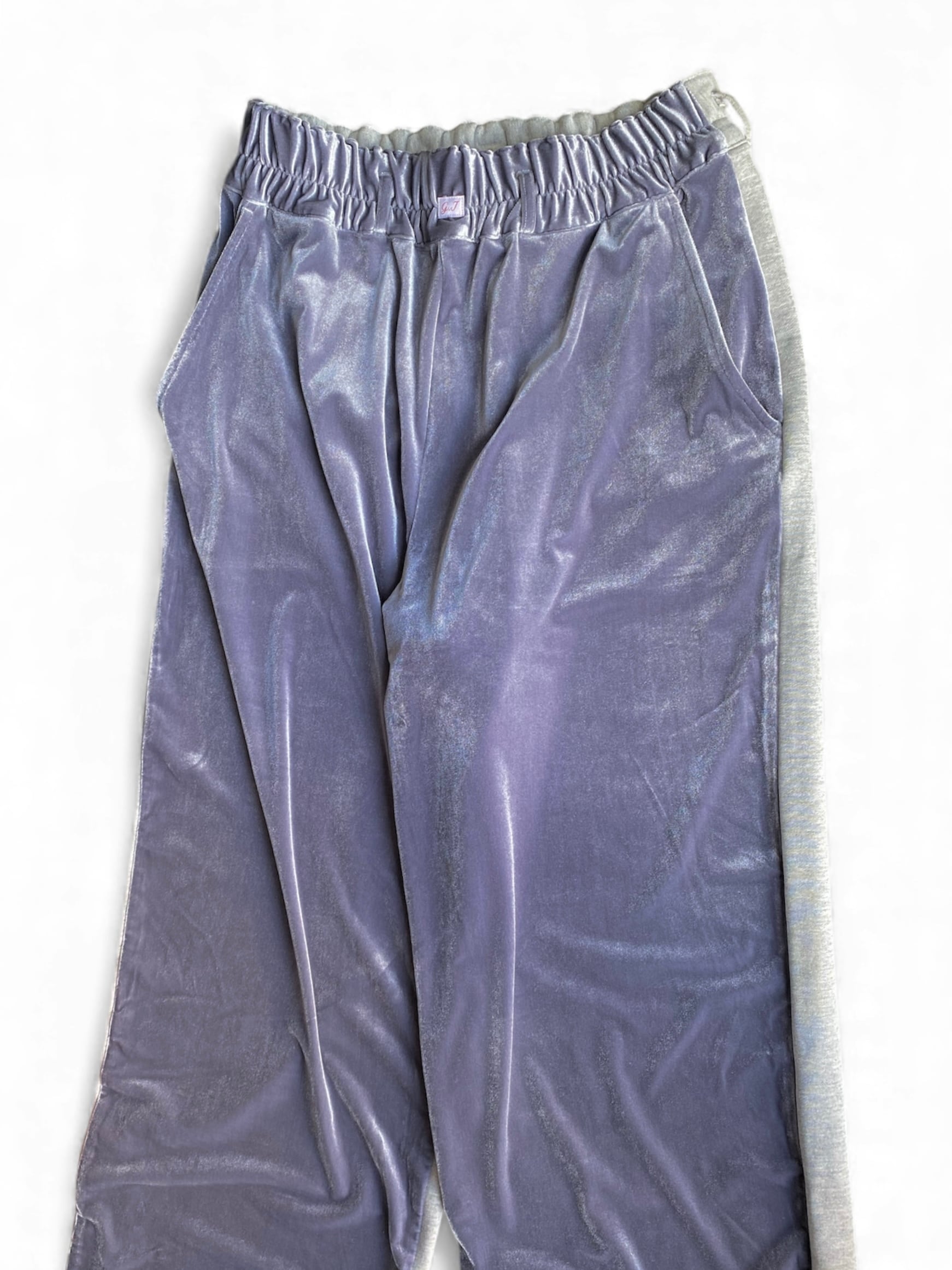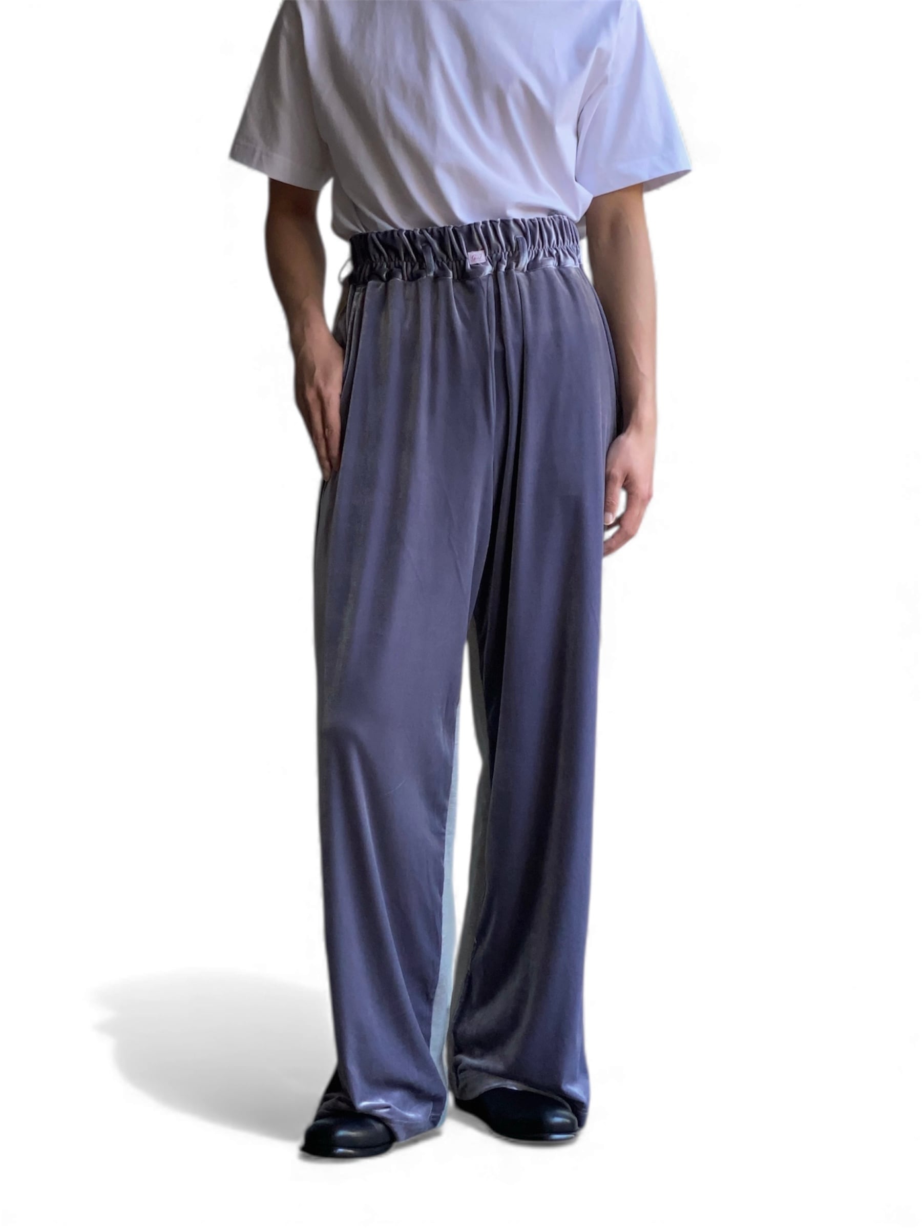 同系色のフロントにベロア、バックにスウェット素材に切り替え、履き心地のイージーさやストリート感も残しつつ、品の良さもプラス。広くとった裾幅と、柔らかい生地故の独特な落ち感。タックインした際には、ウエストのギャザーとg.iロゴがデザインに。